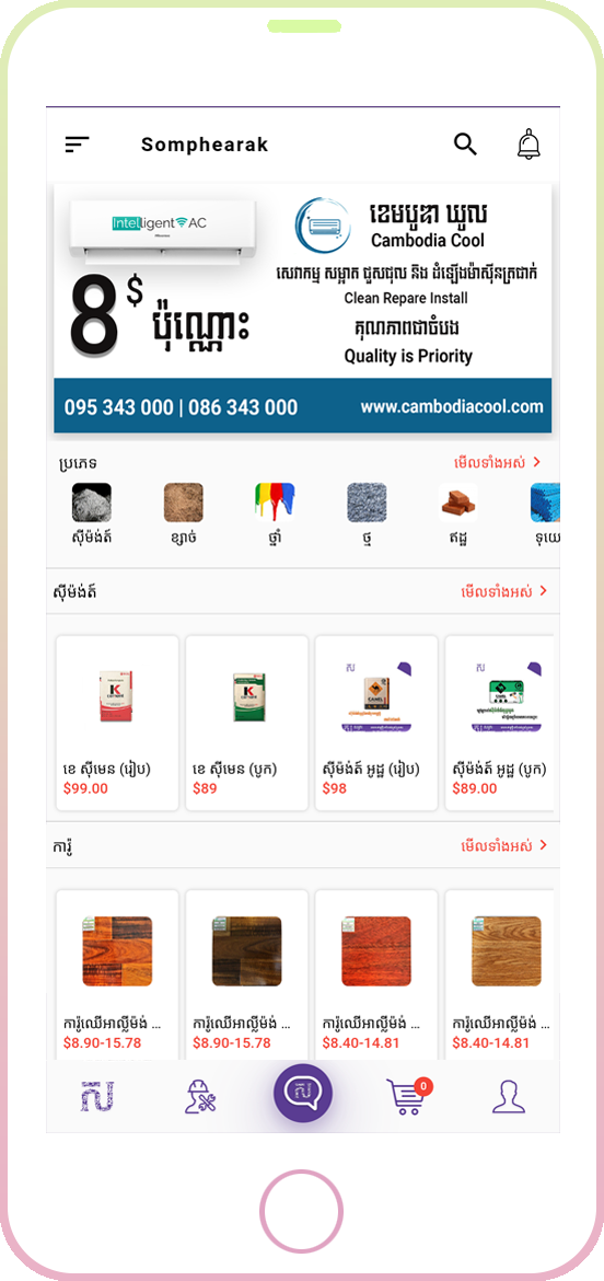 Somphearak is Cambodian online platform for buying construction material, household material, and finding skilled people to complete your tasks (From Data entry to heavy construction work). One stop with exceptional service!